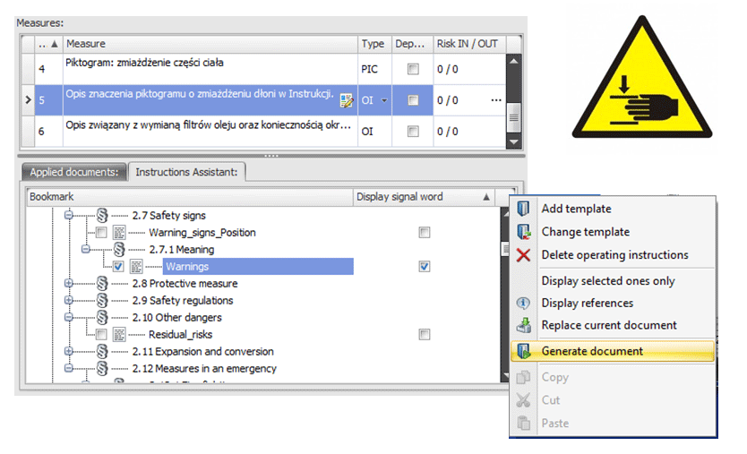 Niezbędnym modułem dodatkowym dla Asystenta jest szablon instrukcji maszyny. Jest to specjalnie przygotowany plik (szablon .dotx), w którym zawarto dedykowane wolne miejsca, które można uzupełniać np. o informacje o produkcie, producencie, zastosowanych normach czy rezultatach oceny ryzyka.
