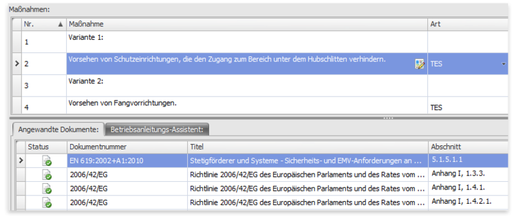 Informacje wprowadzone w ten sposób dają szczególnie duże korzyści. Dzięki nim Safexpert może (codziennie, online) sprawdzić każdy zastosowany środek ochronny pod kątem jego zgodności z zastosowanymi normami.
